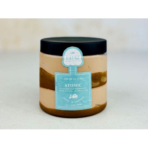 Glace crokito, glace gianduja, sauce chocolat royal et morceaux de cookies.